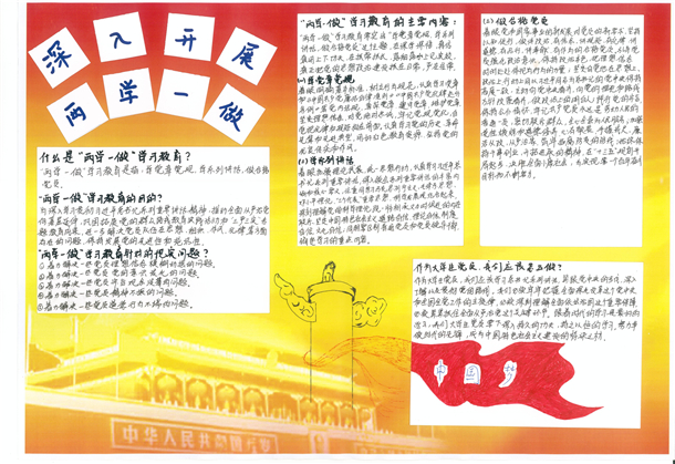 “党支部文化墙”是本党支部文化建设中一面靓丽的旗帜。以手抄报、剪贴报、系列图片展、心得汇报等书面材料的形式展示“两学一做”、“中国梦”等理论学习的成果与体会,在加强党支部内部文化建设的同时也积极地宣传了党员队伍的形象,在师生中间形成了强有力的动员和号召。